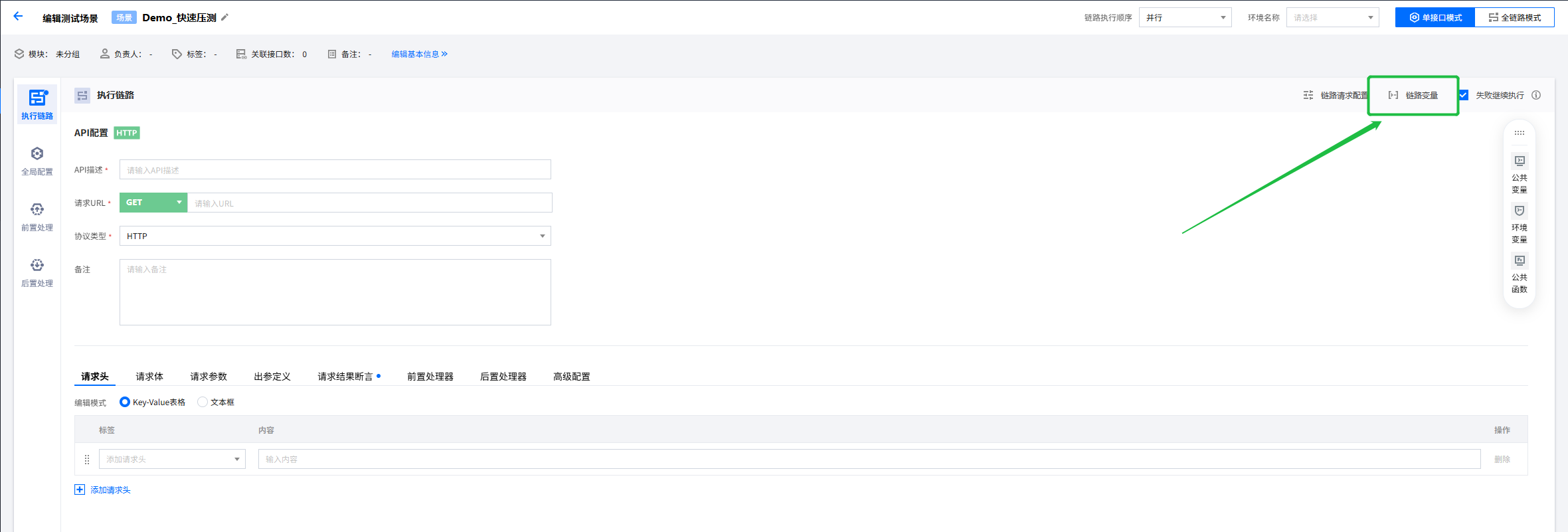 推荐使用全局文件变量,对于多条链路可共享测试数据。